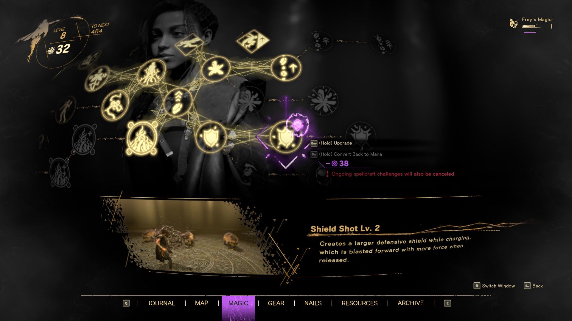 Mágiát pontokból tudunk „vásárolni”, melyekre nem csak szintlépéssel tehetünk szert, hanem a nagyvilágban kalandozva is találhatunk ilyeneket adó forrásokat és olyan kutakat, melyek azonnal megtanítanak egy adott technikát. A parkour is kap némi varázslatos adalékot, így Frey, ameddig bírja állóképességpontokkal, akrobatikus kitérésekkel tudja hatástalanítani az ellene megindított offenzívákat.