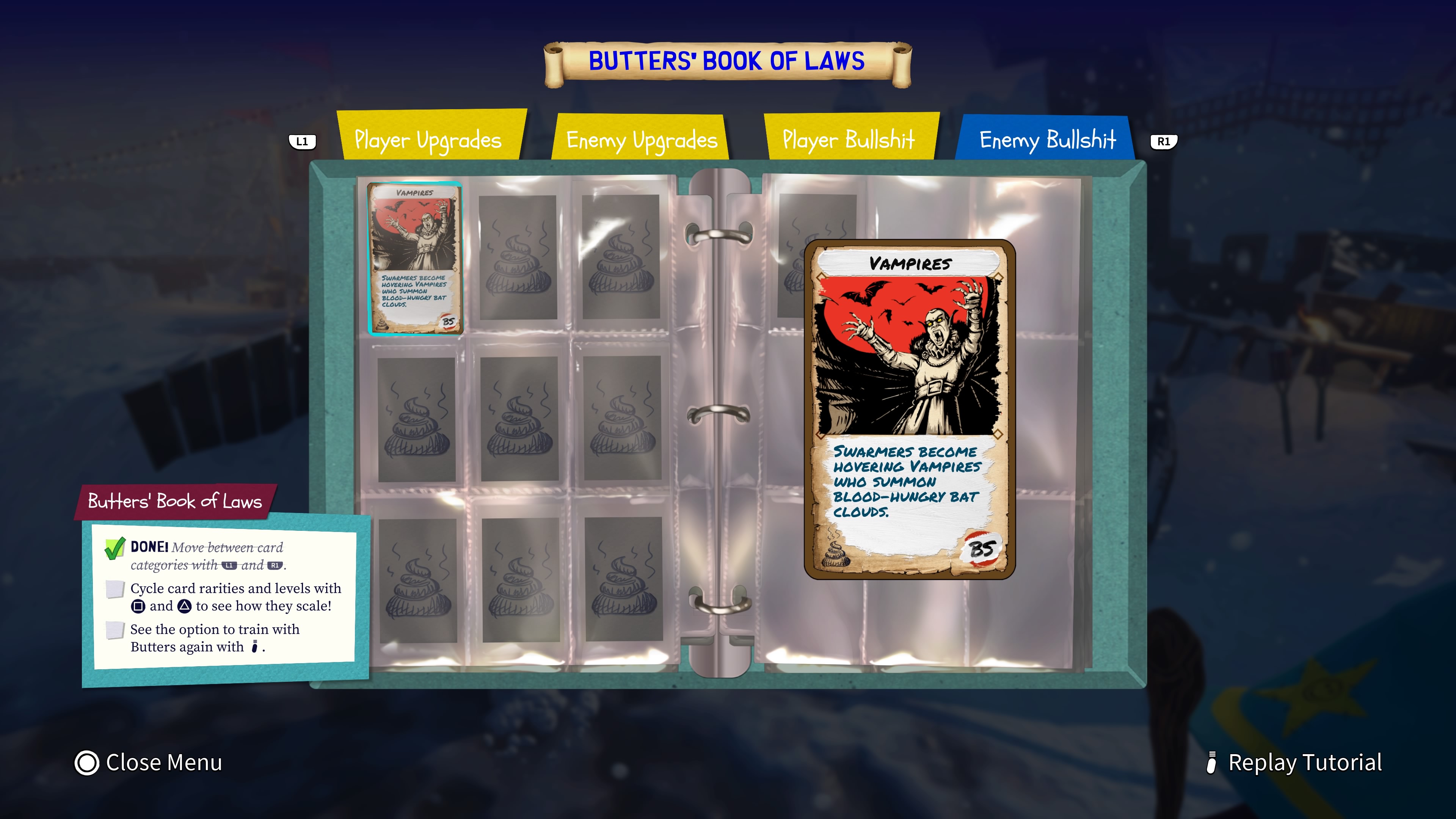 A harci eszközeinket kiegészítve kapunk egy halomnyi képességkáryát és ezen felül, az adott pályákon limitált számmal felhasználható Bullshit lapokat is. Ezek a „papíranduszok” szintén dicséretet érdemelnek, hiszen olyan érzésem volt végig, hogy bizony én is rendelkezni akarok a pakli összes zsugájával és remélhetőleg akár fizikai formában is elérhetővé válnak majd ezen gyönyörűen megrajzolt és ötletes lapok.