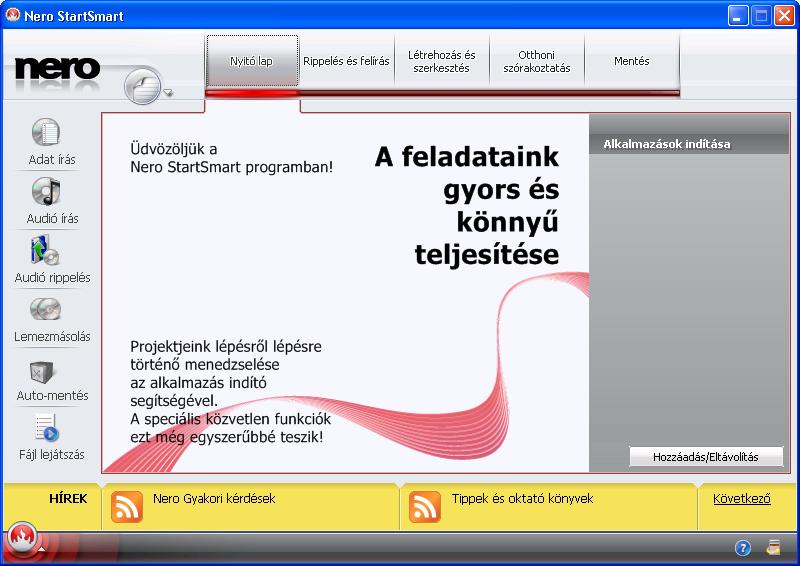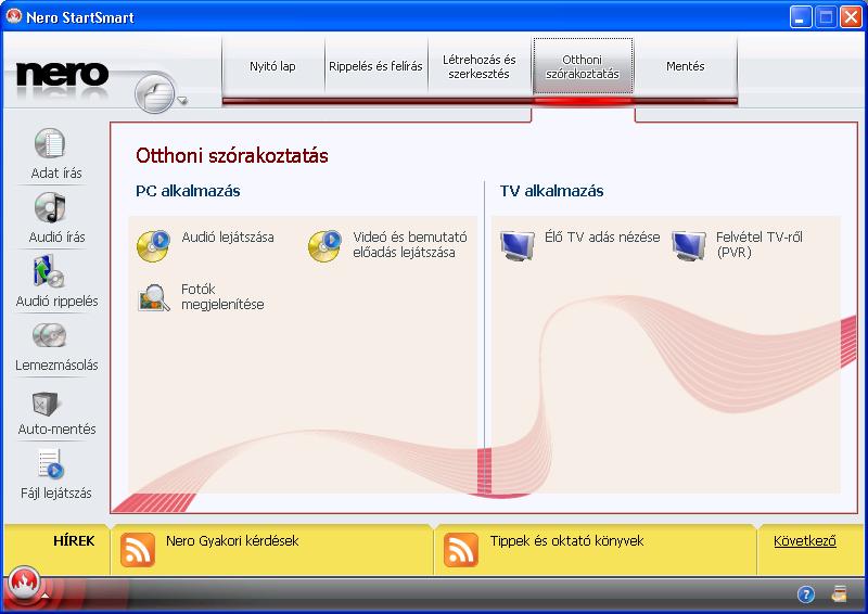 Rippelés és felírás az alábbi funkciókkal: audió CD rippelése és felírása, jukebox lemez írása, adatlemez írása, videó lemez írása.