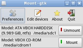 A meglévő partícióink csatolására a legegyszerűbb mód, a „Mount Devices” feliratú ikon indítása. Ekkor elindul a Pcman fájlmenedzser és a mount-gtk. A mount-gtk egy grafikus kezelőfelületet biztosít a meghajtók csatolásához. Itt a felcsatolt eszközök mellett az „Umount”, a leválasztott lemezeknél pedig a „Mount” felirat olvasható az adott eszköz melletti nyomógombon, amivel elvégezhető az eszközök fel- és lecsatolása. Ez csak olvasható módban csatolja fel a partíciókat. Mindemellett mindegyik eszköznél szerepel, hogy melyik mappába lett vagy lehet becsatolni pl.: /media/sdc1.