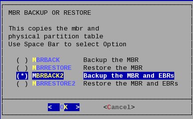 Az MBR, EBR mentése. Az MBR (Master Boot Record, a merevlemez első 512 bájt-ja, ez tartalmazza a partíciók adatait és a rendszer indításához szükséges információkat) mentése hasonlóan történik, annyi különbséggel, hogy a Toogle compression menüpontnál a tömörítést kikapcsoljuk, valamint az utolsó lépésnek nem a Backup menüpontot választjuk, hanem az MBR opciót. Az ezt követő képernyőn el kell döntenünk, hogy csak az MBR-t (ha nincs kiterjesztett partíció ez is elég), ez esetben az MBRBACK pont a megfelelő választás, vagy ha az EBR-t is mentjük (kiterjesztett partícióval rendelkezünk, akkor ezt célszerű választani), akkor az MBRBACK2-t használjuk.