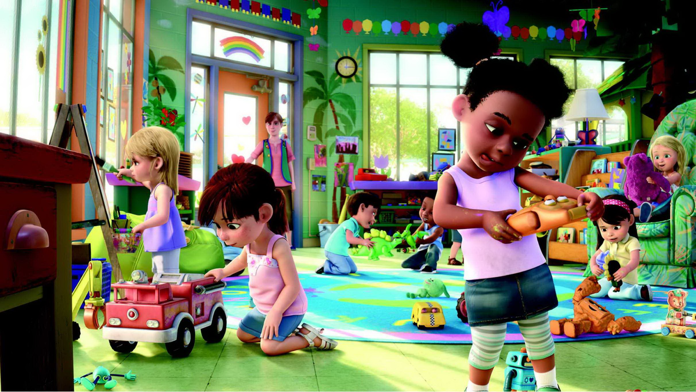 Ha alaposabban átgondoljuk, a Toy Story 3 lényegében arról szól, hogyan képesek a játékok feldolgozni, hogy gazdájuk egyszer elkerülhetetlenül kinövi őket. Ez az előző rész fő témájának továbbvitele (emlékezzünk csak vissza Jessie megindító dalára), de sajnos nem túl tökéletes csomagolásban. Woody-n kívül ugyanis mindenki igen könnyen kész elfogadni, hogy otthagyja Andy-t és ezentúl vadidegen kisgyerekek játsszanak velük. Woody gondolkodása és érvei nem éppen nevezhetőek gondosan felépítettnek: igyekszik meggyőzni a többieket, hogy szökjenek meg a Napsugár Óvodából, hogy visszamehessenek Andy-ék padlására, a nagy terv pedig, hogy a szemeteszsákban csücsülve majd ott várni fogják őt, mikor újra szüksége lesz rájuk. A cowboybábu (aki eddig teljesen racionális, megfontolt és realista volt) képzelgései még Buzz első részbeli illúzióinál is légbőlkapottabbak. És ha nem sikerül kellőképpen magával ragadó, érdekes és – egy Toy Story filmhez mérten – hihető történetet összeeszkábálni, akkor mi marad? Az itt-ott kikandikáló lyukak betömése sok-sok színes-szagos látványelemmel, és persze a rutinszerű poénok elsütése – amivel amúgy nincs is akkora baj. Miért érzem úgy, hogy amint leírok a Toy Story 3 gyengeségei közül egy újabbat, egyből meg is védem a filmet, mondván sokkal rosszabb is lehetne?
