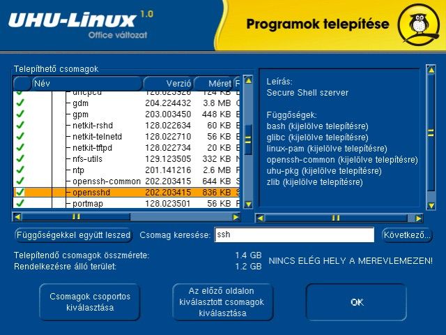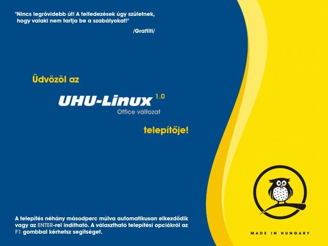 Egyszerűen használható grafikus telepítőAz UHU-Linux telepítése és beállítása grafikus telepítőjének, automatikus hardverfelismerő rendszerének köszönhetően a legtöbb gépen problémamentesen, egyszerűen végrehajtható. Az UHU-Linux telepítője úgy készült, hogy ez -a művelet a számitástechnikával még csak most ismerkedők számára se jelentsen komoly feladatot. Néhány egérkattintás, és a számítógép teljesítménytől függően 20-30 perc telepítési idő után készen is vagyunk! A grafikus telepítő jól áttekinthető, kimondottan az elvégzendő feladatokra koncentrál. Magyar ismertetők teszik érthetővé mi is történik a számítógéppel. Az alapértelmezett telepítés roppant egyszerű, nagyon intuitív, kiterjed a hardverelemek automatikus felismerésére és beállítására. Nem kell feltétlenül ismerni a Linuxos programokat, mivel csomagcsoportokba szervezve minden megtalálható ami a mindennapi munkához szükséges lehet. Mindazonáltal nem árt utána nézni a telepítés előtt, hogy a gépben nincs-e olyan hardver elem, amit a Linux automatikus felismerője nem támogat.